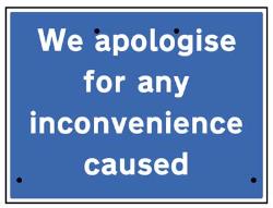 56419: We apologise for inconvenience caused, 600x450mm Re-Flex Sign (3mm reflective polypropylene)