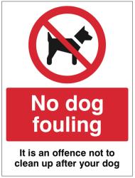 23674K: No dog fouling It is an offence not to clean up after your dog Material: 2: Self Adhesive Vinyl Size: K (400x300mm)