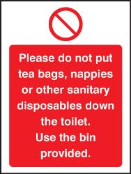13629A: Please do not put tea bags etc down toilet use bins provided Material: 1: Rigid Plastic Size: A (100x75mm)