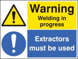 14527K: Warning welding in progress extractors must be used Material: 1: Rigid Plastic Size: K (400x300mm)
