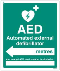 25995H: AED located in XXX metres - arrow left Material: 2: Self Adhesive Vinyl Size: H (300x250mm)