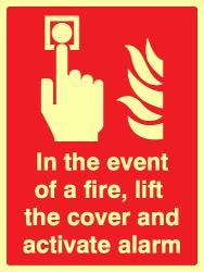 31079K: In the event of a fire lift the cover and activate alarm Material: 3: Photoluminescent Rigid Size: K (400x300mm)